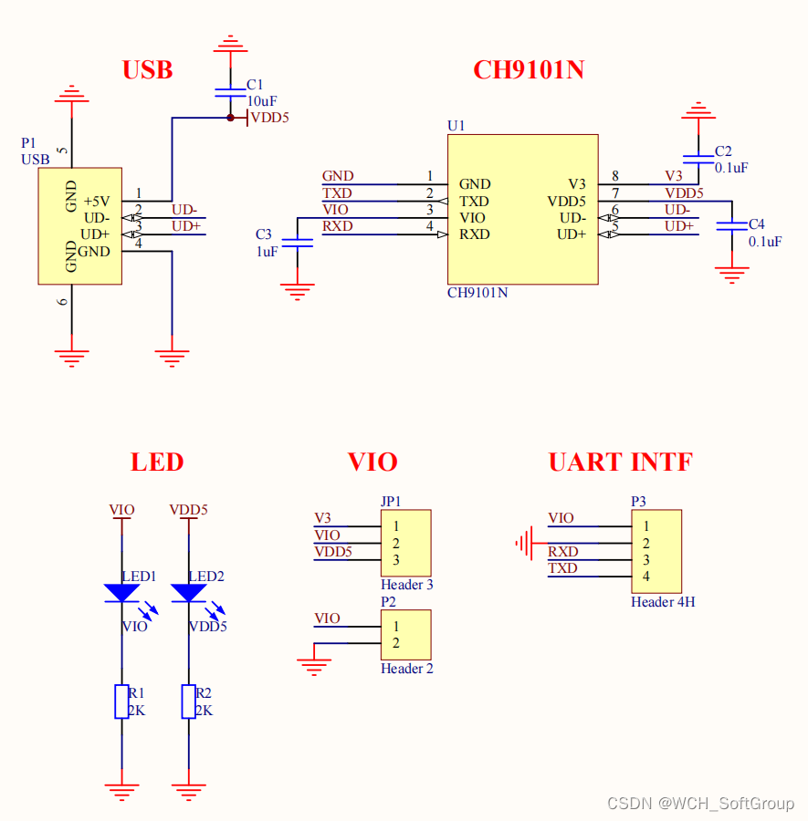 VDD5和V3引脚外部需要外接电源退耦电容,默认104规格,且PCB布局时靠近芯片引脚放置。