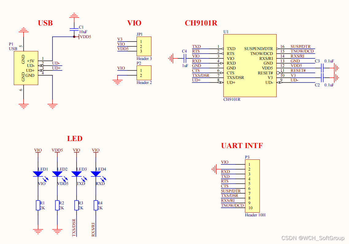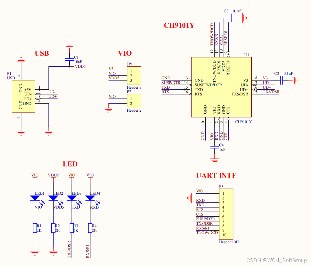 CH9101芯片有3个电源端分别是VDD5、V3和VIO,芯片内置3.3V的LDO电源调节器。VDD5是内部LDO的输入端,V3是内部LDO的输出端,USB收发器和内核电源均从该引脚输入,VIO是单独的串口IO等引脚的电源输入。