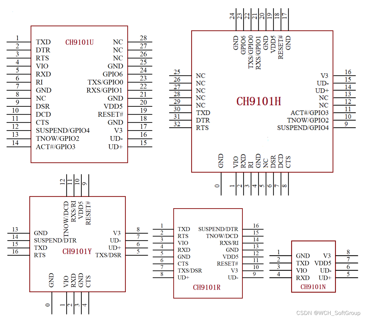 CH9101芯片属于沁恒第三代USB转串口芯片系列的单串口型号,基于经典版CH340芯片完成技术革新,实现USB转高速异步串口,支持最高6Mbps串口波特率。CH9101提供了5种封装,CH9101U、CH9101H、CH9101Y、CH9101R、CH9101N。其中CH9101U/CH9101H和FT232RL/FT232RQ/PL2303GC/PL2303HXD引脚兼容,CH9101Y/CH9101R和FT230XS/FT230XQ引脚兼容,CH9101N和PL2303GL引脚兼容。