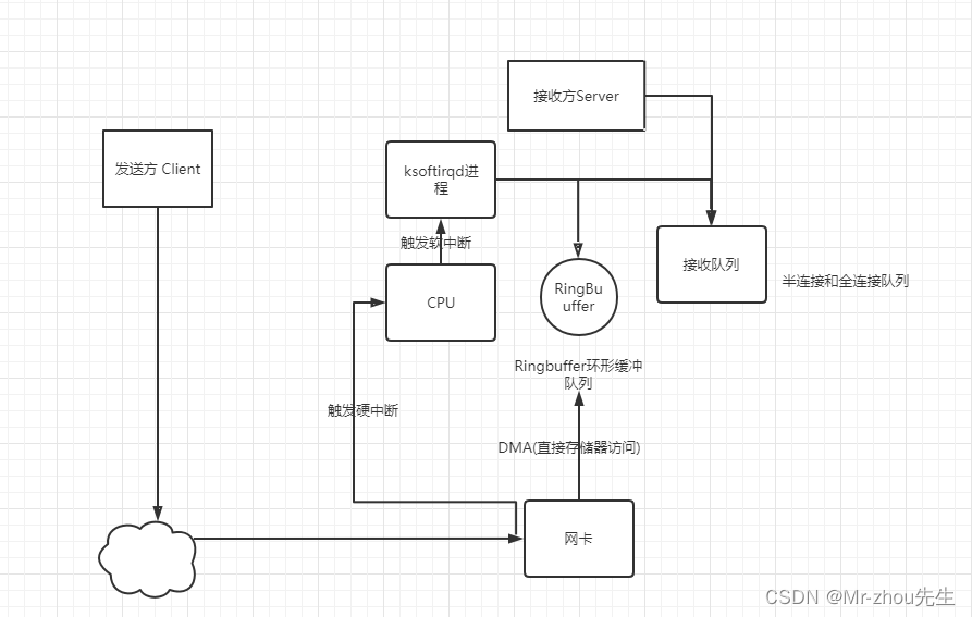 2、网卡接收到数据,并通过DMA直接存储器访问将数据搬运到内存Ringbuffer中,并触发硬中断告诉CPU,有数据到来了,你要处理数据。此处你需要了解一下什么是DMA直接存储器访问,百度百科了解一下,总体来说DMA是一个搬运工,负责搬运不同媒介内存中的数据。