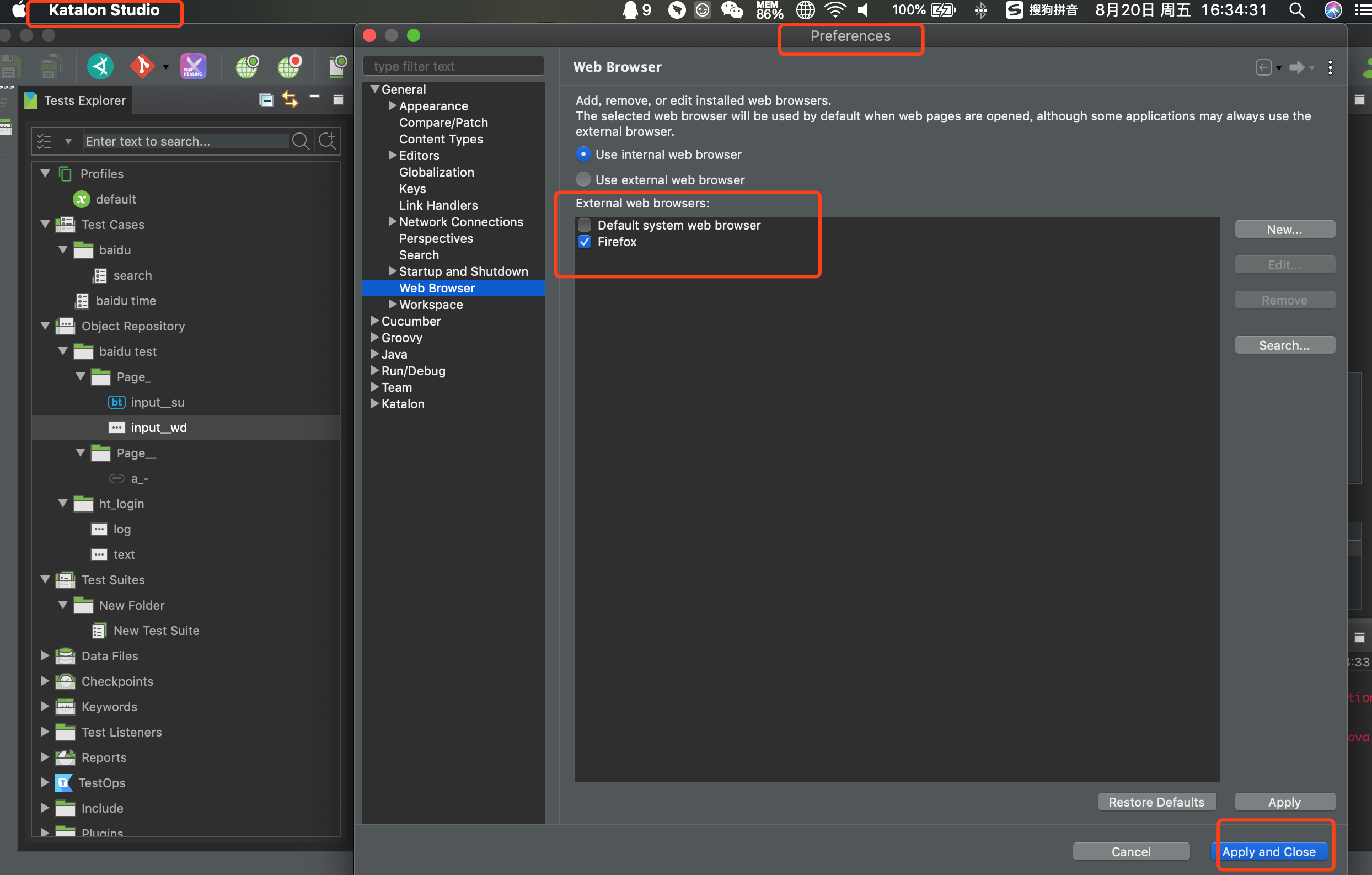 katalon 最新版 适配 各浏览器版本不同 执行时可能报错 根据报错可更换到低版本浏览器适配 或者更换其他已安装可运行浏览器 推荐使用Firefox chrome