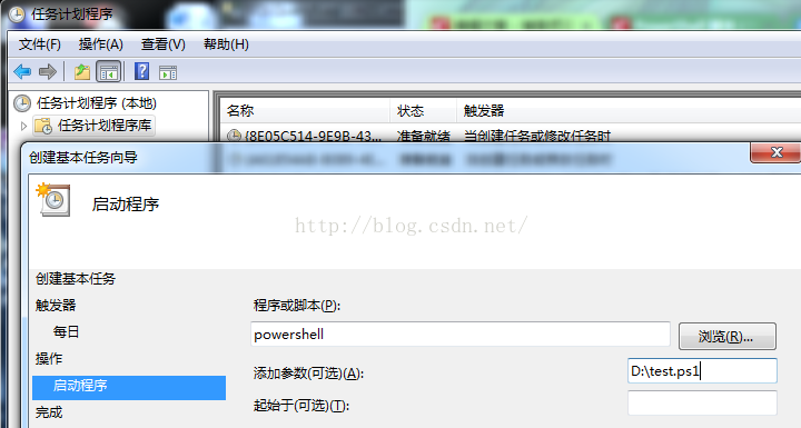 在 程序或脚本 这里填写的和平时调用 bat 的不同,以往这里一般是执行脚本( bat) 的路径,但是这里只写上关键字 ”powershell“,而在添加参数(可选) 这里写上 ps1脚本的完整路径。