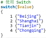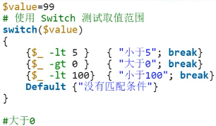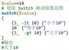 使用switch时缺省的比较运算符-eq等于,也可以自行定制比较条件,将条件放入花括号中,必须保证条件表达式的返回值为布尔类型“$True”或“$False”。
