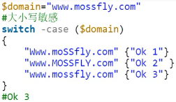 switch有一个case选项,一旦指定了这个选项,比较运算符就会从-eq切换到-ceq,即大小写敏感比较字符串。