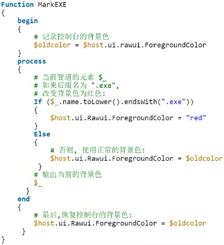 如果一个函数内部使用了管道,就可以定义三个基础的任务区:第一步,完成函数的初始化,完成函数执行的预备步骤;第二步处理递归调用所得的结果;最后进行收尾工作。这三个任务区分别可以使用begin,process,end语句块。