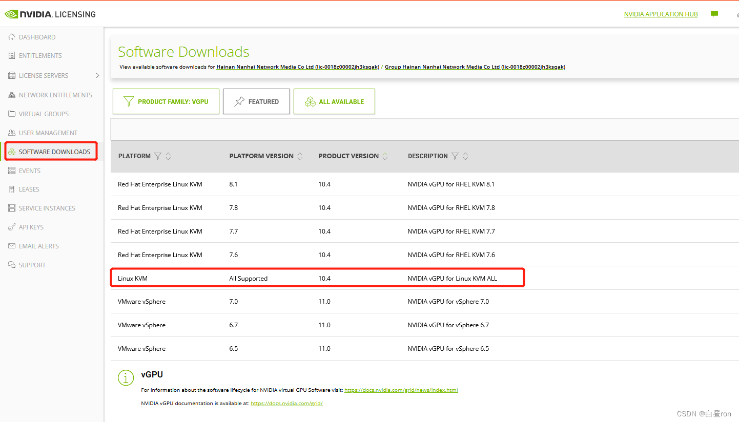 建议在下载驱动之前联系服务器厂家,确认虚拟机显卡驱动的适配版本,如果驱动版本不适配,会造成各种麻烦,另外,虚拟机的显卡驱动下载方式和物理机的有所不同,需要在NVIDIA许可界面中推荐的驱动列表中下载,如下图,CAS虚拟化选择Linux KVM: