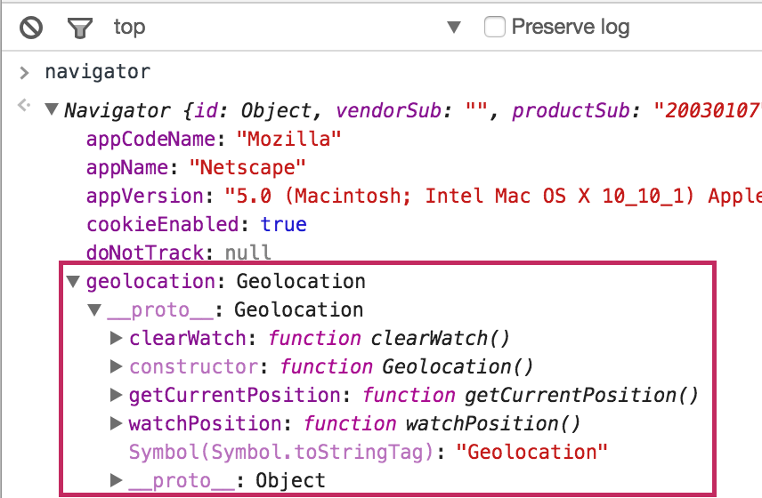 首先,我们可以从浏览器的navigator对象中通过geolocation属性获取到一个Geolocation的实例,如下图所示: