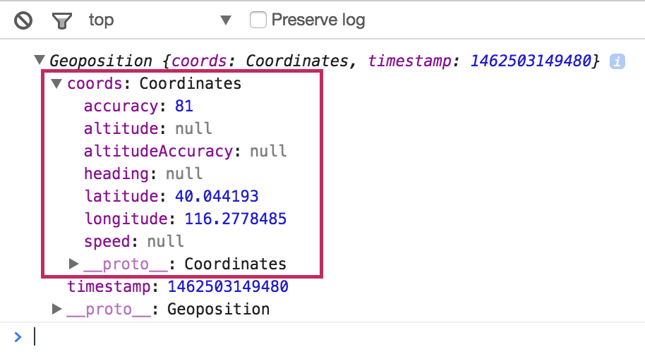 可以看到,position实际上是一个Geoposition对象的实例,其中包括coords和timestamp两个属性,后者是一个时间戳,记录获取到位置时的时间,coords里面包含了很多位置有关的信息: