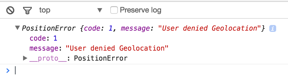 回到刚才的确认框,如果我们点击了Block阻止该站点获取当前的位置信息,代码就会授权失败,相应地,失败的回调函数就会被触发,error错误对象也会被传入回调函数,我们的打印信息如下: