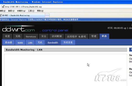 第四步:需要提醒一点的是默认每个图都需要容许控件安装一次,在DD-WRT中一共有三次。安装完毕后我们就能够看到WAN,LAN以及总带宽各个类别实 时流量和速度的显示了,从这里更可以直观的了解当前路由交换设备的运行情况,相比上文介绍的MONOMO工具来说这种监控准确率更高不会产生任务偏差。