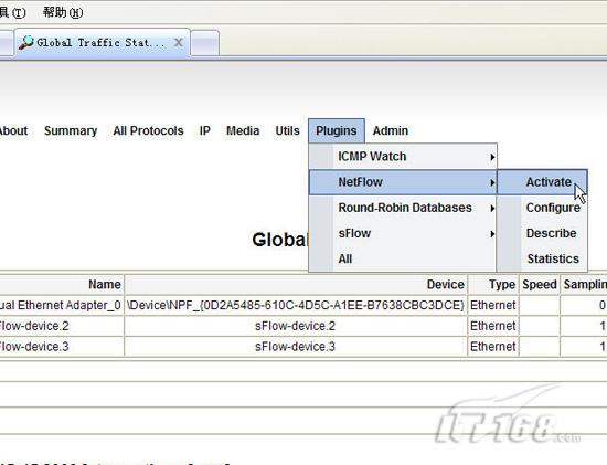 第五步:访问NTOP管理界面后我们首先会看到存在的虚拟接口,我们不需要管这个直接点 “plugins”->“netflow”->“Activate”将netflow监控开启。当然我们也可以选择 “plugins”->“all”然后选择开启netflow即可。