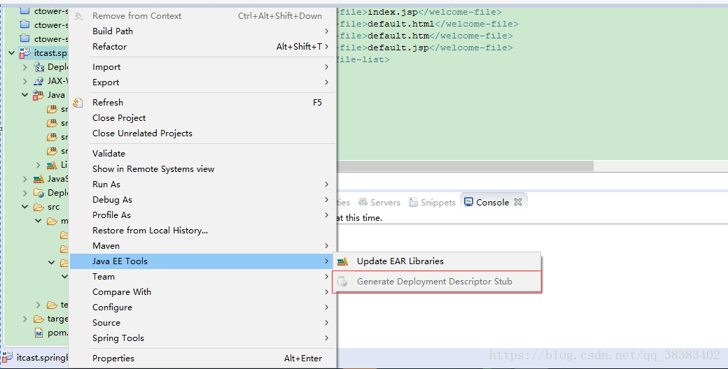 勾选项目右键点击——>Java EE Tools——>Generate Deployment Descriptor Stub.然后系统会在src/main/webapp/WEB_INF文件加下创建web.xml文件。