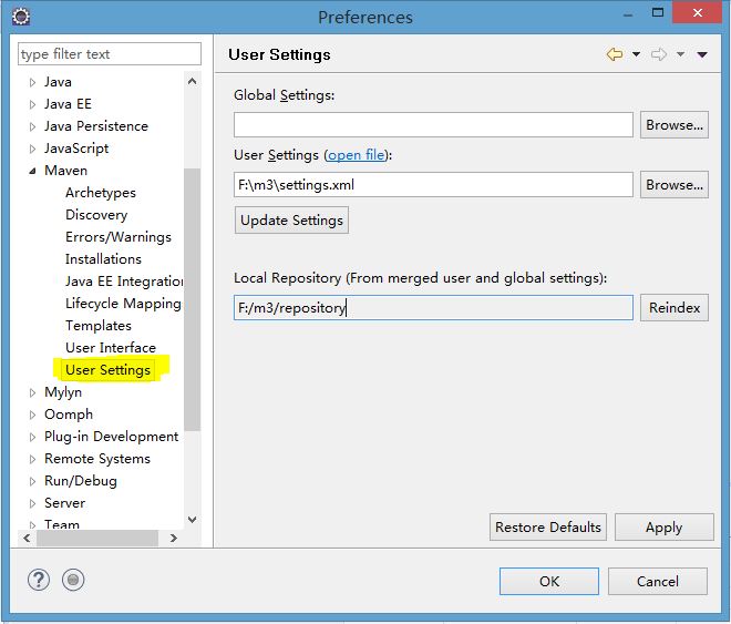保存所做的修改,同时还需要把这个settings.xml文件复制一份到“F:/m3”目录下
