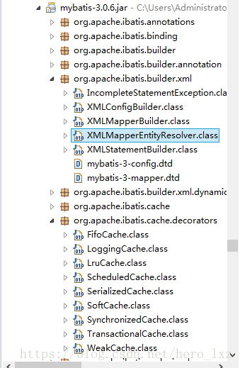 这两行代码,setEntityResolver()这个方法是设置校验的,然后我通过调试,找到这个方法中的参数对应的对象是org.apache.ibatis.builder.xml.XMLMapperEntityResolver这个类的一个对象,然后我打开这个类源码进行查看,发现这个类竟然是将xml对应的通过公网上的dtd文件进行校验改成了通过本地jar包中的dtd文件进行校验,感觉已经找到原因了,然后我再找到这个本地jar包中的dtd文件org/apache/ibatis/builder/xml/mybatis-3-mapper.dtd 果然,这个jar包中是没有定义bind标签的,现在就好办了,找到了问题原因是jar引起的,那么升级这个jar的版本就解决了。