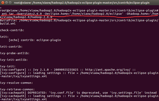 ant jar -Dversion=2.6.0 -Declipse.home='/home/xiaow/hadoop2.0/eclipse' # 刚才放进去的eclipse软件包的路径 -Dversion=2.6.0 hadoop的版本号