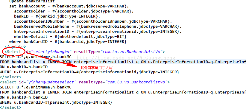Caused by: org.springframework.core.NestedIOException: Failed to parse mapping resource: 'file [E:apache-tomcat-7.0.52webappsCOFCOWEB-INFclassescomlumappingBankcardlistMapper.xml]'; nested exception is org.apache.ibatis.builder.BuilderException: Error creating document instance. Cause: org.xml.sax.SAXParseException: Element type "Select" must be declared.