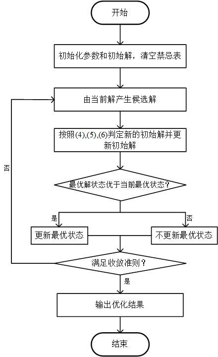 禁忌搜索算法的基本思想是:对一个以某种方法获得的初始解,在一种邻域范围内对其进行一系列变化,从而得到许多候选解;从这些候选解中选出最优候选解,再将此最优解导致的最优状态与被禁忌的解导致的最优状态比较,以选出最优解,并将该解作为新的初始解,最后将其加入禁忌表(如果是禁忌解则更新禁忌期限);然后将此最优解对应的状态与当前最优解状态进行比较,若其优于当前最优状态,就选择该状态作为新的当前最优状态;如果所有的解都被禁忌,则直接选择禁忌解中的最佳值作为新的初始解,选定新的初始解后再更新禁忌表,并判断是否更新最优状态;如果禁忌表为空时直接取可行解中的最优值作为新的初始解,选定新的初始解后再更新禁忌表,并判定是否更新最优状态。重复上述过程,直到满足停止准则。其算法步骤如下: