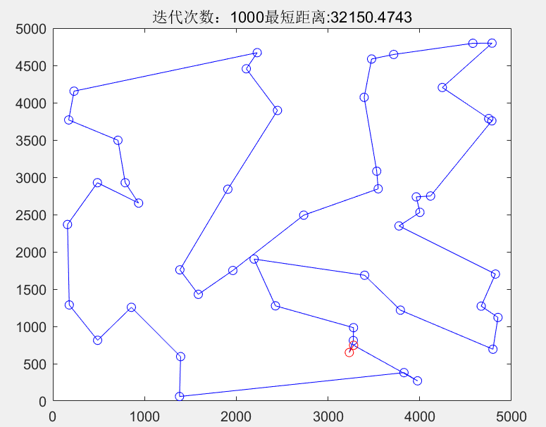 title(['迭代次数:', num2str(iter),'最短距离:',num2str(Bdist)]);