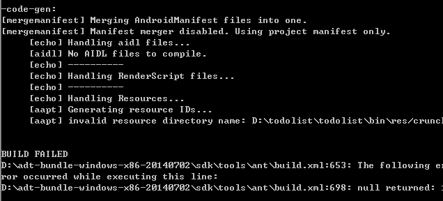 Ant and the ADT Plugin for Eclipse are packing the .apk file in a different build chain and temp generation folders. Crunch is created by the ADT. Best to do is to start every step with a clean if you switch between the tools. use ant clean if you used the ADT from eclipse before. UseProjects -> clean ... in Eclipse if you used ant before. Hope this solves your problem. Also restarting Eclipse could help.