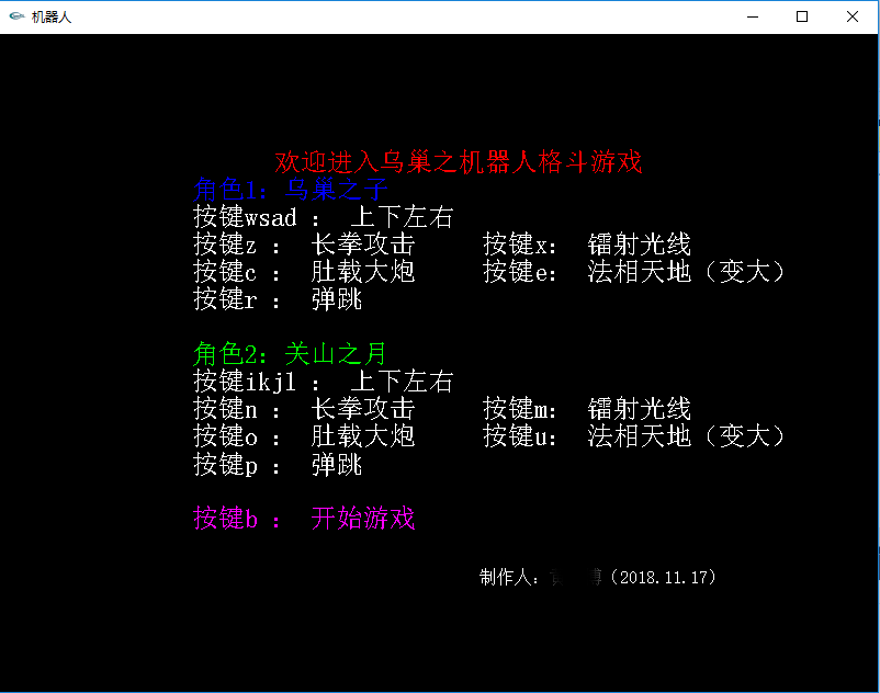 项目的创意设想:当前ai大火,机器人也是日常生活中的一个热点,自己在小学乃至高中也经常玩格斗游戏。曾经也想过格斗游戏是怎么做的,可是那时候条件有限,而且也没有编程基础。这个想法就一直留到了大学。到大三学习计算机图形学,也有了一定的编程基础,认为这个格斗游戏可以自己完成了。便开始动手,经过几天的努力,终于把这个游戏实现了。