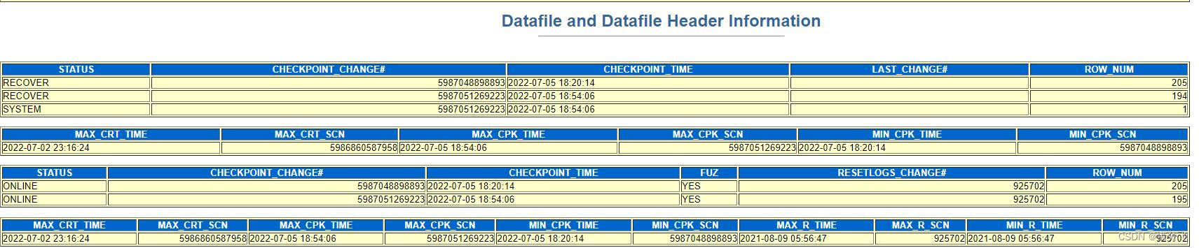 | Parallel Media Recovery started with 127 slaves ORA-279 signalled during: ALTER DATABASE RECOVER database using BACKUP CONTROLFILE ... Wed Jul 06 02:41:04 2022 ALTER DATABASE RECOVER LOGFILE '+DATA3/xffdb/archivelog/2022_07_05/thread_2_seq_40889.18030.1109269215' Media Recovery Log +DATA3/xffdb/archivelog/2022_07_05/thread_2_seq_40889.18030.1109269215 Wed Jul 06 02:41:04 2022 Errors with log +DATA3/xffdb/archivelog/2022_07_05/thread_2_seq_40889.18030.1109269215 Errors in file /u01/app/oracle/diag/rdbms/xffdb/xffdb1/trace/xffdb1_pr00_96503.trc: ORA-00325: archived log for thread 1, wrong thread # 2 in header ORA-00334: archived log: '+DATA3/xffdb/archivelog/2022_07_05/thread_2_seq_40889.18030.1109269215' ORA-325 signalled during: ALTER DATABASE RECOVER LOGFILE '+DATA3/thread_2_seq_40889.18030.1109269215' ... ALTER DATABASE RECOVER CANCEL Media Recovery Canceled Completed: ALTER DATABASE RECOVER CANCEL ………… Wed Jul 06 02:22:25 2022 ALTER DATABASE RECOVER DATABASE Media Recovery Start started logmerger process Only allocated 127 recovery slaves (requested 128) Parallel Media Recovery started with 127 slaves Wed Jul 06 02:22:28 2022 Errors in file /u01/app/oracle/diag/rdbms/xffdb/xffdb1/trace/xffdb1_pr00_77044.trc: ORA-00313: open failed for members of log group 7 of thread 1 Media Recovery failed with error 313 Errors in file /u01/app/oracle/diag/rdbms/xffdb/xffdb1/trace/xffdb1_pr00_77044.trc: ORA-00283: recovery session canceled due to errors ORA-00313: open failed for members of log group 7 of thread 1 Wed Jul 06 02:22:28 2022 Errors in file /u01/app/oracle/diag/rdbms/xffdb/xffdb1/trace/xffdb1_m000_77318.trc: ORA-00322: log 4 of thread 2 is not current copy ORA-00312: online log 4 thread 2: '+DATA3/xffdb/onlinelog/group_4.16148.1107795635' Errors in file /u01/app/oracle/diag/rdbms/xffdb/xffdb1/trace/xffdb1_m000_77318.trc: ORA-00322: log 7 of thread 1 is not current copy ORA-00312: online log 7 thread 1: '+DATA3/xffdb/onlinelog/group_7.18959.1107796013' Errors in file /u01/app/oracle/diag/rdbms/xffdb/xffdb1/trace/xffdb1_m000_77318.trc: ORA-00314: log 9 of thread 1, expected sequence# 133495 doesn't match 133490 ORA-00312: online log 9 thread 1: '+DATA3/xffdb/onlinelog/group_9.3142.1107796071' Checker run found 208 new persistent data failures ORA-10877 signalled during: ALTER DATABASE RECOVER DATABASE ... ………… Only allocated 127 recovery slaves (requested 128) Parallel Media Recovery started with 127 slaves ORA-279 signalled during: ALTER DATABASE RECOVER database using backup controlfile ... Wed Jul 06 06:15:26 2022 ALTER DATABASE RECOVER LOGFILE '+DATA3/xffdb/onlinelog/group_4.16442.1107795653' Media Recovery Log +DATA3/xffdb/onlinelog/group_4.16442.1107795653 ORA-279 signalled during: ALTER DATABASE RECOVER LOGFILE '+DATA3/xffdb/onlinelog/group_4.16442.1107795653' ... Wed Jul 06 06:15:43 2022 ALTER DATABASE RECOVER LOGFILE '+DATA3/xffdb/onlinelog/group_7.18959.1107796013' Media Recovery Log +DATA3/xffdb/onlinelog/group_7.18959.1107796013 Wed Jul 06 06:15:50 2022 Errors with log +DATA3/xffdb/onlinelog/group_7.18959.1107796013 Wed Jul 06 06:15:50 2022 Errors in file /u01/app/oracle/diag/rdbms/xffdb/xffdb1/trace/xffdb1_pr29_306479.trc (incident=961030): ORA-00600: internal error code, arguments: [6102], [13], [17], [], [], [], [], [], [], [], [], [] Incident details in: /u01/app/oracle/diag/rdbms/xffdb/xffdb1/incident/incdir_961030/xffdb1_pr29_306479_i961030.trc Use ADRCI or Support Workbench to package the incident. See Note 411.1 at My Oracle Support for error and packaging details. Wed Jul 06 06:15:54 2022 Sweep [inc][961030]: completed Sweep [inc2][961030]: completed Slave exiting with ORA-10562 exception Errors in file /u01/app/oracle/diag/rdbms/xffdb/xffdb1/trace/xffdb1_pr29_306479.trc: ORA-10562: Error occurred while applying redo to data block (file# 159, block# 3591756) ORA-10564: tablespace LIS ORA-01110: data file 159: '+DATA1/xffdb/datafile/lis.379.1080445903' ORA-10561: block type 'TRANSACTION MANAGED INDEX BLOCK', data object# 138875 ORA-00600: internal error code, arguments: [6102], [13], [17], [], [], [], [], [], [], [], [], [] Wed Jul 06 06:15:59 2022 Recovery Slave PR29 previously exited with exception 10562 |
