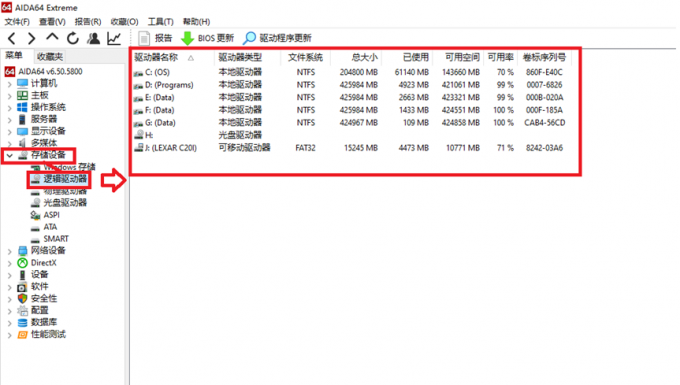 在AIDA64中,依次点击存储设备,逻辑驱动器,就可以查看所有逻辑驱动器的空间使用情况。