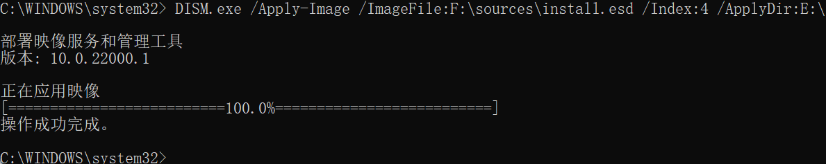 DISM.exe /Apply-Image /ImageFile:F:sourcesinstall.esd /Index:4 /ApplyDir:E: