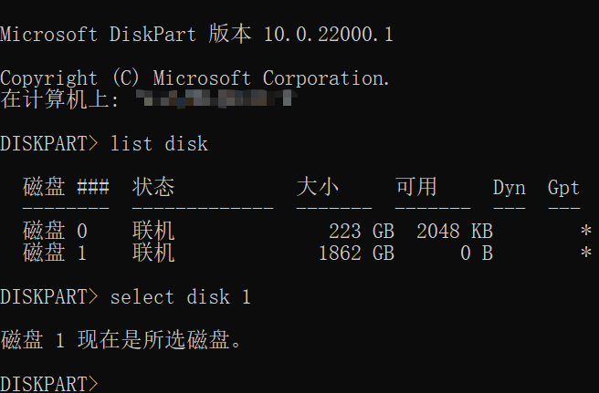 在弹出的窗口中输入“list disk”,显示所有磁盘,输入“select disk n”(n为你想装系统的移动硬盘,我这里是1),选择此硬盘。