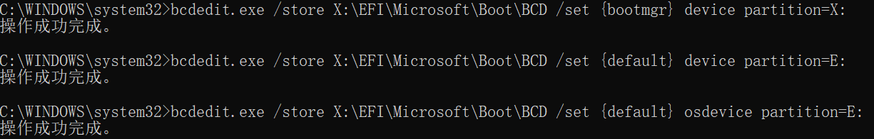 第一条命令的意思是在X盘创建启动文件,告诉电脑真正的系统在E:Windows里面。后面三条命令是对BCD的一些简单修改,因为第一条命令创建的启动文件并不能直接使用,需要修改。执行完上面的命令后界面如下: