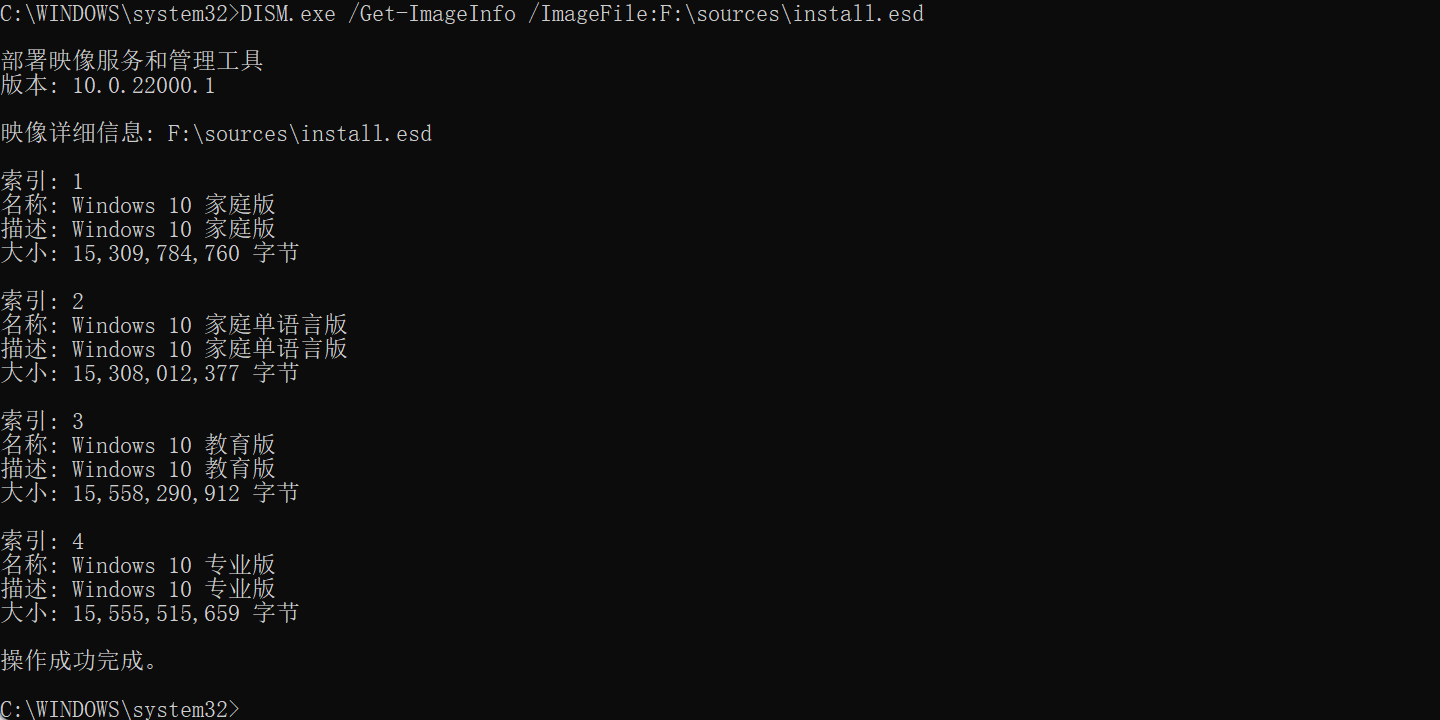其中F:sourcesinstall.esd中的“F”是一开始下载的ISO装载后的盘符,可以改成你自己的盘符,后面的“install.esd”也可以是“install.wim”,后者是以前使用的映像后缀。显示出来一共有四个版本,也可能只有一个版本,想安装那个版本就记住索引,比如我想安装专业版就记住4。