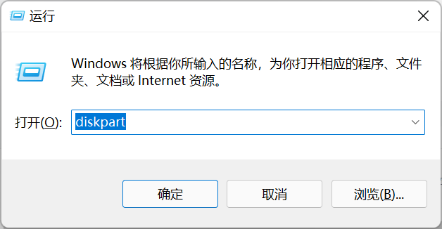 按Windows键+R键打开运行,输入“diskpart”,回车。