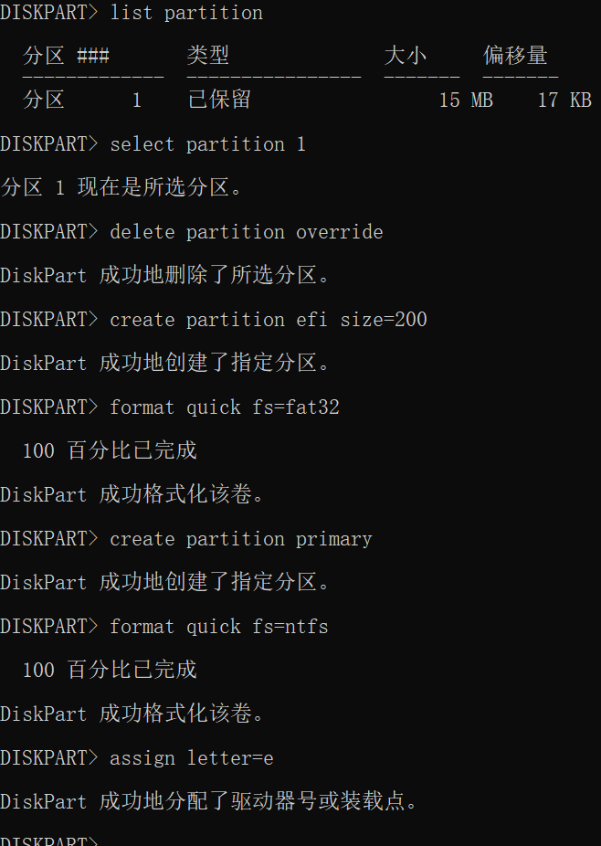 后面三条命令的意思是创建大小为200MB的EFI分区,格式化,分配盘符X。这次创建的是启动分区,size=后面的200是可以改的,单位MB,不建议100以下。“format quick fs=fat32”是快速格式化,1GB以下的分区可以不加“quick”,1GB以上建议加一下“quick”,fs=后面是文件系统,这里选fat32。“assign letter=x”是分配盘符X,什么盘符都可以,用过的不行。这里创建的是EFI系统分区,系统将从这里启动。