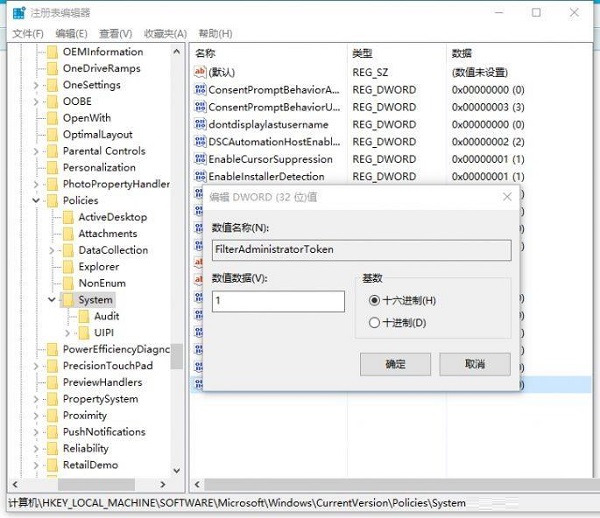 在右侧找到FilterAdministratorToken项,如果没有就新建一个DWORD(32位),命名为“FilterAdministratorToken”,将它的数值数据更改为“1”,其他的不动,重启电脑后就行了。