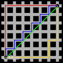 图中绿色代表欧氏距离,红线代表曼哈顿距离,其他三条折线也表示了曼哈顿距离,这三条折线的长度是相等的。