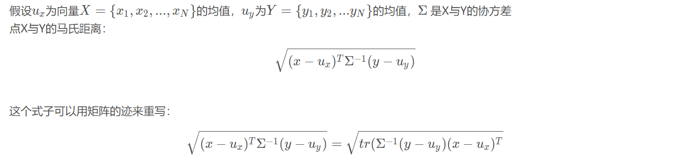 - 如果Σ是单位矩阵(各个样本向量之间独立同分布),则马氏距离退化成欧式距离;