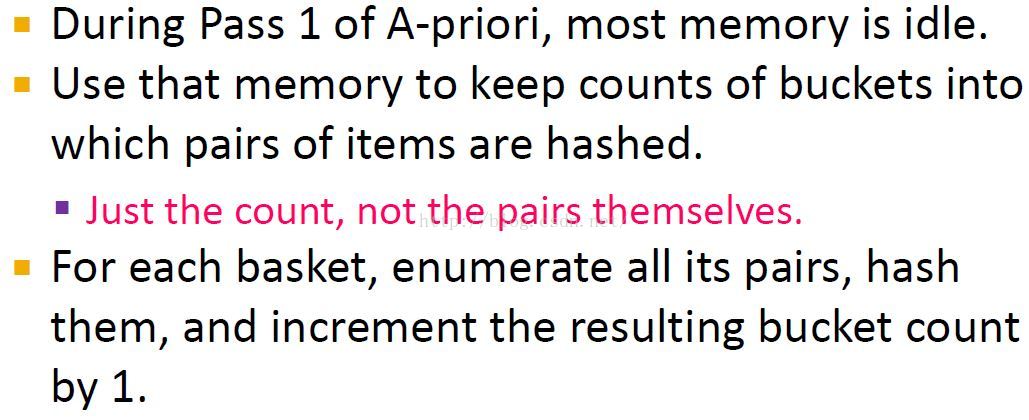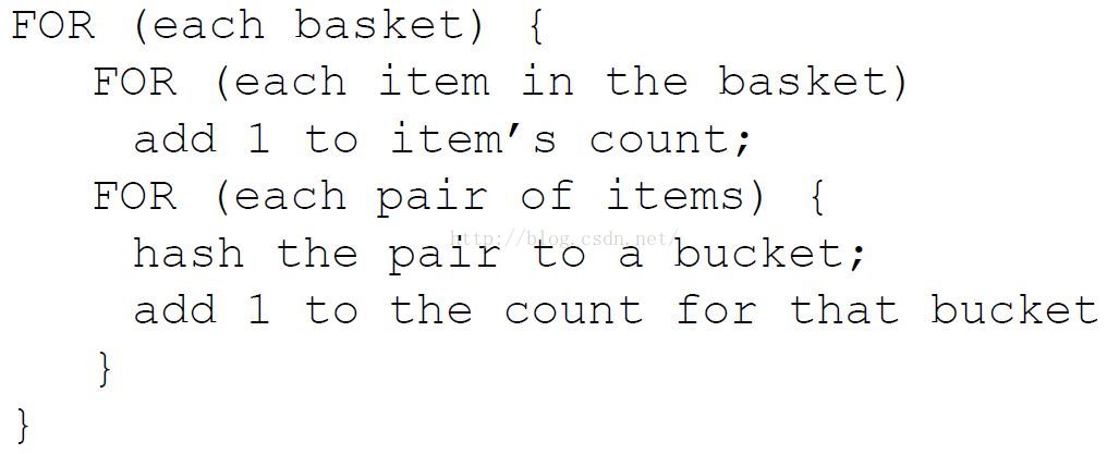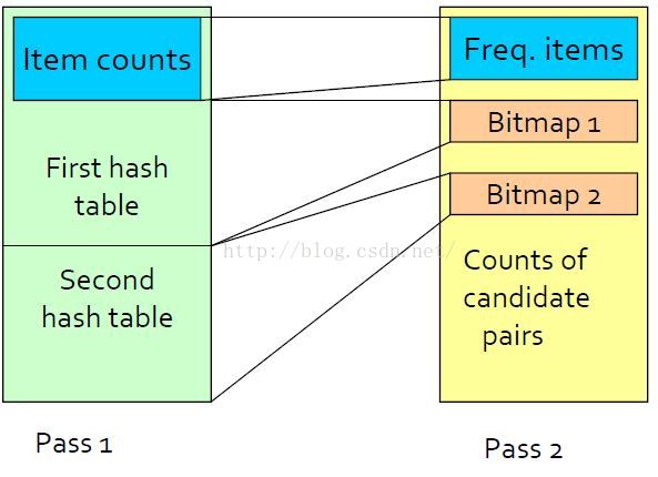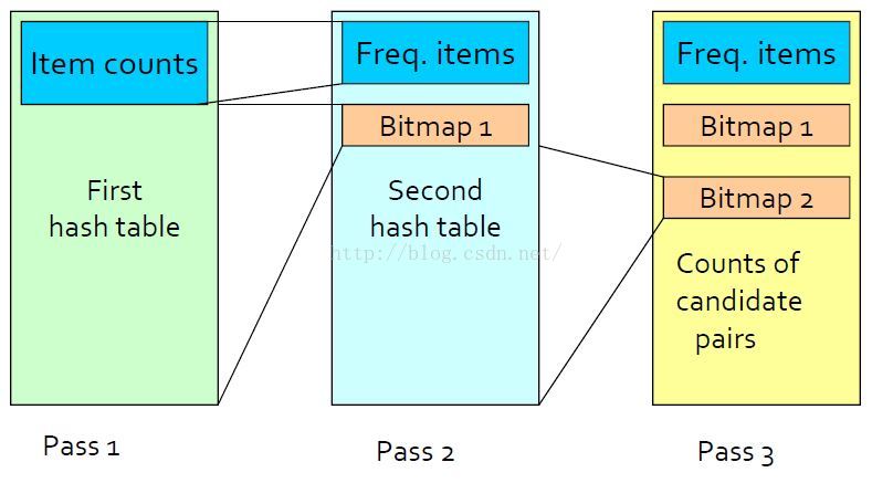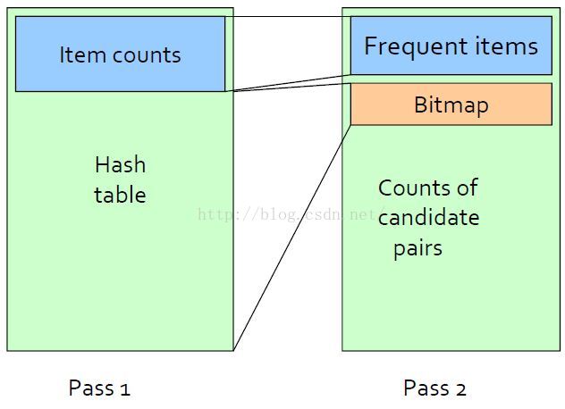 从basket中统计项的个数用于寻找频繁一项集,并从每个basket中产生所有项对,并为项对创建一张hash表,hash表只是统计hash到本桶的项对的个数。
