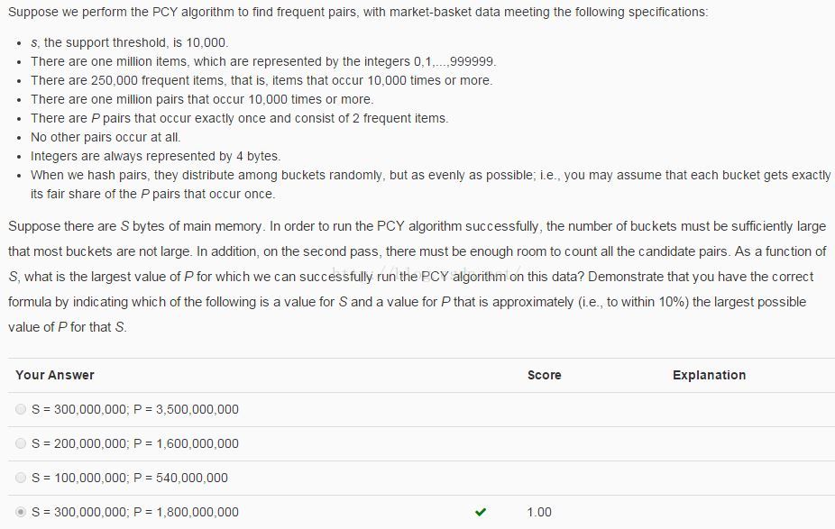 第一步中的内存消耗:4*B + 4*I <=S,由于4个选项中S的数量级都为10^8,故可认为4*B <=S, 也就是说桶的数目S最多为B = S/4,这也是保证PCY算法成功运行的条件(桶数目要足够大,题目中也有说明)