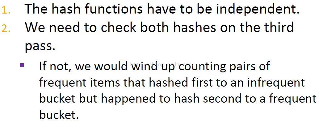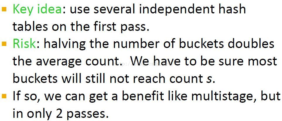 很显然,在算法中可用在第一步和最后一步中添加任意多的中间步骤。这里的限制就是在每一步中必须用一个bitmap来保存前一步的结果,最终这里会使得没有足够的内存来做计数。不管我们使用多少步骤,真正的频繁项对总是被哈希到一个频繁桶中。If PCY gives you an average count of 1 tenth of the support threshold,then you can use five hash tables instead.