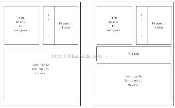 Multistage的第三步--计算候选频繁项对,一开始第二个hash表同样被压缩成bitmap。该bitmap也同样保存在内存中。这时,两个bitmap加起来也只占到不到空闲内存的1/16,还有相当的内存可用来做第三步的计算候选频繁项对的处理。