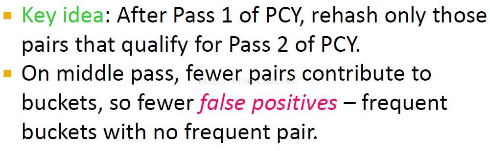 我们知道,在PCY第一次遍历后,得到的频繁桶中也可能都是非频繁项对。如果我们能再次对PCY的候选项对进行一次hash(使用另一种hash函数),就能进一步删除掉候选项对中的非频繁项对。。