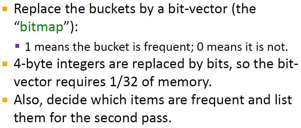 在PCY算法第二步操作前,哈希表被压缩为bitmap,在这里,每一个bit用作一个桶。若桶为频繁桶,则位置1,否则置0。这样32bit的整数被压缩为只有1bit。然后再PCY的第二步操作中,bitmap只占了原来所用空间的1/32。