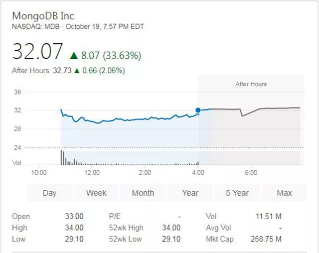 在提交 IPO 申请之后,总部位于纽约的凯源数据库公司 MongoDB 于本周四在纳斯达克正式上市。当天收盘时,MongoDB 的股价从开盘的 24 美元一路高歌至 32.07 美元,涨幅约 34% 。