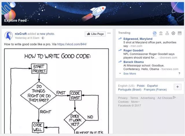 日前,Facebook 证实向桌面客户端和移动客户端用户推出 Explore Feed 功能。据了解,该功能将能帮助用户发现其好友以及“点赞”页面分享之外的内容。 这部分内容基于用户在过去点赞的内容、分享以及其好友中间流行的内容推送,另外它还会推送来自用户未关注来源的同类型帖子、文章、图片和视频。