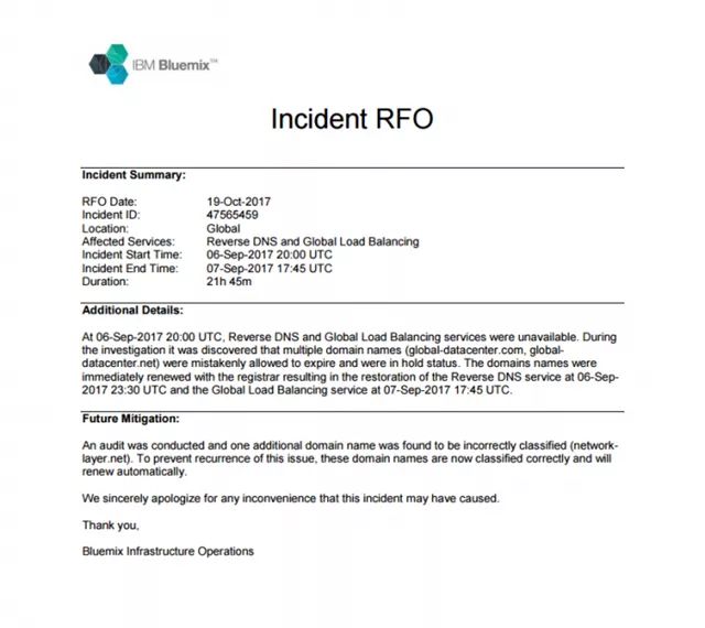 IBM 的负载均衡和反向 DNS 服务器上个月发生了长达 21 小时的故障,蓝色巨人一开始将这起故障归罪于它正转移部分域名的第三方域名注册商,称注册商意外将域名设置为“保留状态”阻止了域名转移。现在 IBM 公布了事故报告,称原因是多个域名过期没有及时更新。
