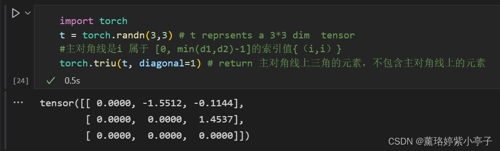 print(torch.triu(t, diagonal=1)) # return 主对角线上三角的元素,不包含主对角线上的元素