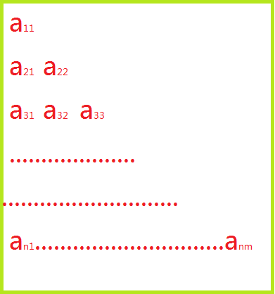 那既然是这样,我们在内存中,就没有必要把这个矩阵全部保存,只要保存一半就可以了,余下的一半就用a[m][n] = a[n][m],来表示,这样就节省下来一半的内存.那么这个三角矩阵在内存中是怎么存储的呢