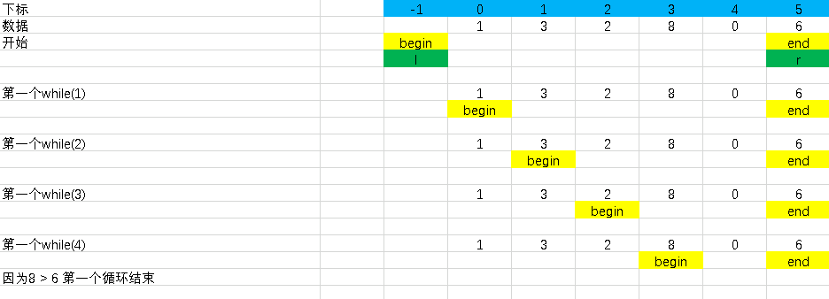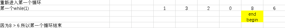 假象一下,如果不进行交换,那么在下一次循环结束之后,begin会停留在6元素,end会停留在2元素,如下图