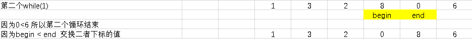 7、第二个循环退出后,如果死循环未退出,在重新进入第一个循环之前,我们需要对下标为begin和end所指的元素进行交换,这一步非常重要。