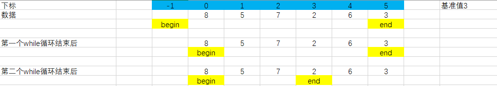 无论说把6安置在begin或者end位置,都不能保证数组中以6为基准,左半边的元素比6小,右边的元素比6大了。