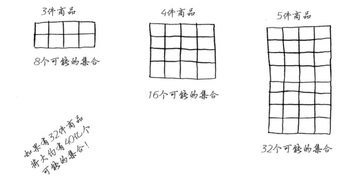 这样可行,但速度非常慢。在有3件商品的情况下,你需要计算8个不同的集合;有4件商品时,你需要计算16个集合。每增加一件商品,需要计算的集合数都将翻倍!这种算法的运行时间为O(2n),真的是慢如蜗牛。只要商品数量多到一定程度,这种算法就行不通。